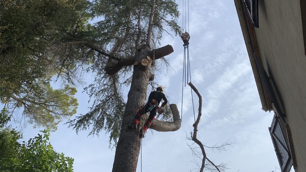 "Elimination d'un arbre d'environ 25m fendu en deux, sans accès possible pour un support moteur."